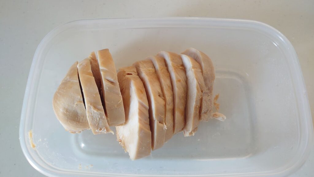 鶏むね肉の場合はゆでると水分が抜けますので、100g当たりタンパク質約30gになります。(ゆで具合による)