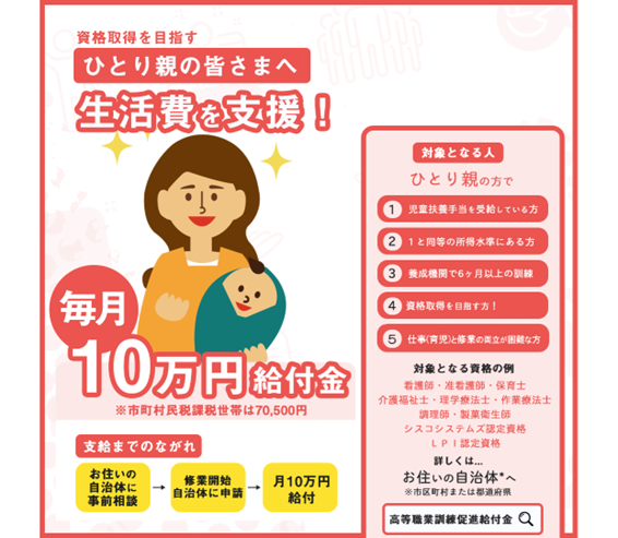 これは、ひとり親が資格取得やスキル習得のために修業する期間、月額最大10万円が支給される制度です。